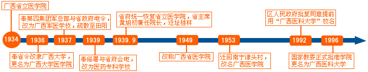 1934年7月广西省立医学院成立,10月开始招收六年制本科生,开创了广西高等医学本科教育之先河,是全国建校最早的22所医学院校之一。此后,校名先后四次变更,校址七次迁移,师生颠沛流离,在借用的民房、戏院、会馆和自搭的草棚中坚持办学,“造本省之才,为本省之用”,一切以广西少数民族地区需要和“强国、救省、健民”为办学方针,致力培养广西高级医学人才。